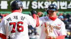 [OSEN=인천, 박준형 기자] 23일 인천 SK행복드림구장에서 열린 ‘2019년 신한은행 마이카 KBO리그’ 개막전 SK 와이번스와 kt 위즈의 경기, 4회말 2사 1,3루 SK 노수광이 동점 1타점 적시타를 날리고 박재상 코치와 하이파이브를
