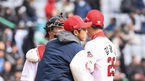 [OSEN=인천, 박준형 기자] 23일 인천 SK행복드림구장에서 열린 ‘2019년 신한은행 마이카 KBO리그’ 개막전 SK 와이번스와 kt 위즈의 경기, 1회초 2사 2,3루 SK 손혁 투수 코치가 마운드에 올라 김광현과 이야기를 나누고 있다. / so