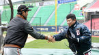[OSEN=창원, 지형준 기자] 23일 창원NC파크에서 열린 '2019 신한은행 MY CAR KBO리그 개막전' NC 다이노스와 삼성 라이온즈의 경기, 경기에 앞서 이승엽 해설위원이 NC 이호준 코치와 인사를 나누고 있다. /jpnews@osen.co.kr