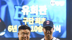 [OSEN=잠실,박준형 기자] 28일 오후 서울 잠실구장에서 진행된 '2019년 신한은행 마이카 KBO리그’ 두산 베어스와 키움 히어로즈의 경기에 앞서 두산 유희관이 두산 최초 6년 연속 10승 달성 기록 시상식에서 수상한뒤 포즈를 취