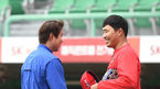 [OSEN=인천, 곽영래 기자] 6일 오후 인천 SK행복드림구장에서 열리는 ‘2019 신한은행 MY CAR KBO리그' SK 와이번스와 삼성 라이온즈의 경기에 앞서 삼성 김한수 감독과 SK 한동민이 이야기를 나누고 있다./youngrae@osen.co.kr