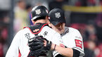 [OSEN=수원, 이동해 기자] 6일 오후 수원 케이티위즈파크에서 열린 '2019년 신한은행 마이카 KBO리그' KT 위즈와 LG 트윈스의 경기, KT 위즈가 2:1 짜릿한 승리를 거뒀다.경기 후 김재윤-장성우 배터리가 승리의 기쁨을 함께 나누고 있다