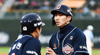 [OSEN=부산,박준형 기자] 11일 오후 부산 사직구장에서 '2019 신한은행 MY CAR KBO리그' 롯데 자이언츠와 두산 베어스의 경기가 진행됐다.1회초 무사 2루 두산 정진호가 선취 1타점 적시타를 날린뒤 고영민 1루 코치와 이야기를 나누고