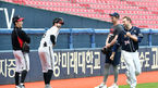 [OSEN=잠실, 지형준 기자] 14일 오후 서울 잠실야구장에서 ’2019 신한은행 MY CAR KBO 리그’ LG 트윈스와 두산 베이스의 경기가 열린다.경기에 앞서 두산 린드블럼, 후랭코프와 LG 켈리, 윌슨이 이야기를 나누고 있다. /jpnews@osen.