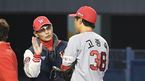 [OSEN=잠실, 박재만 기자] 18일 오후 서울 잠실야구장에서 ‘2019 신한은행 MY CAR KBO리그’ 두산 베어스와 SK 와이번스의 경기가 열렸다.경기에서 4-3으로 승리를 거둔 SK 염경엽 감독이 다익손을 격려하고 있다. /pjmpp@osen.co.kr