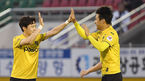 [OSEN=광양, 곽영래 기자] 22일 오후 전남 광양시 광양축구전용구장에서 '하나원큐 2019 K리즈 2' 전남 드래곤즈와 서울 이랜드 FC의 경기가 열렸다.전반 전남 김영욱이 선제골을 넣은 뒤 김건웅과 기뻐하고있다. / youngrae@osen.co.kr