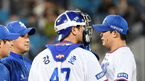 [OSEN=대구, 곽영래 기자] 24일 오후 대구 삼성라이온즈파크에서 ‘2019 신한은행 MY CAR KBO리그' 삼성 라이온즈와 SK 와이번스의 경기가 열렸다.5회초 1사 1루 삼성 오치아이 코치가 마운드에 올라 김대우와 이야기를 나누고 있다..