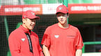 [OSEN=부산, 이동해 기자] 1일 오후 부산 사직구장에서 '2019 신한은행 MY CAR KBO리그' 롯데 자이언츠와 NC 다이노스의 경기가 열릴 예정인 가운데 그라운드 훈련이 진행됐다.훈련 시작 전 NC 박민우가 베탄코트에게 오뎅 국물을 권하