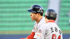 [OSEN=잠실, 이대선 기자] 21일 오후 서울 잠실야구장에서 ‘2019년 신한은행 마이카 KBO리그’ LG 트윈스와 SK 와이번스의 경기가 열렸다.2회초2사 2루에서 SK 배영섭이 중전 적시타를 치고 조동화 코치를 보며 미소를 짓고 있