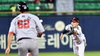 [OSEN=잠실, 박재만 기자] 23일 오후 서울 잠실야구장에서 ‘2019 신한은행 MY CAR KBO리그’ LG 트윈스와 SK 와이번스의 경기가 열렸다.5회초 2사 만루 SK 배영섭의 타구를 LG 김민재가 몸을 날려 잡은 뒤 2루로 글러브 토스하고 있