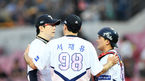 [OSEN=광주, 이대선 기자] 25일 오후 광주기아챔피언스필드에서 ‘2019년 신한은행 마이카 KBO리그’ KIA 타이거즈와 kt wiz의 경기가 열렸다.8회초 2사 만루에서 마운드를 방문한 KIA 서재응 코치가 양현종, 한승택과 이야기를 나