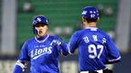 [OSEN=잠실, 박재만 기자] 28일 오후 서울 잠실야구장에서 ‘2019 신한은행 MY CAR KBO리그’ 두산 베어스와 삼성 라이온즈의 경기가 열렸다.5회초 2사 삼성 공민규가 안타를 날린 뒤 강명구 코치와 하이파이브를 하고 있다. /pjmp