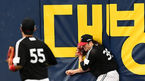 [OSEN=고척, 박재만 기자] 30일 오후 고척 스카이돔에서 '2019 신한은행 MY CAR KBO리그' 키움 히어로즈와 LG 트윈스의 경기가 열렸다.3회말 2사 1,2루 LG 류제국이 키움 샌즈의 안타성 타구를 잡아준 이형종에게 고마움을 표하고 있다. /p