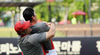 [OSEN=수원, 곽영래 기자] 31일 오후 수원 케이티위즈파크에서 열리는 ‘2019 신한은행 마이카 KBO리그' KT 위즈와 두산 베어스의 경기에 앞서 양팀 훈련 시간이 진행됐다.KT 샌디 게레로 코치와 두산 김재환과 인사를 나누고 있다.
