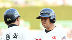 [OSEN=인천, 민경훈 기자] 2일 오후 인천 SK행복드림구장에서 ’2019 신한은행 MY CAR KBO리그' SK 와이번스와 한화 이글스의 경기가 열렸다.5회말 2사 SK 최정이 좌익수 오른쪽 안타를 날린 후 1루에서 조동화 코치와 하이파이브를