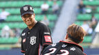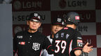 [OSEN=잠실, 최규한 기자] 4일 오후 서울 잠실야구장에서 ’2019 신한은행 MY CAR KBO리그' LG 트윈스와 KT 위즈의 경기가 열렸다.1회초 1사 2, 3루 상황 KT 유한준의 내야 땅볼 때 홈을 밟은 김민혁이 이강철 감독과 인사를 나누고 있