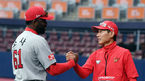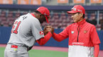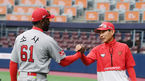 [OSEN=고척, 이동해 기자] 5일 오후 서울 고척스카이돔에서 열릴 예정인 ’2019 신한은행 마이카 KBO리그' 키움 히어로즈와 SK 와이번스의 경기에 앞서 그라운드 훈련이 진행됐다.SK 염경엽 감독이 소사와 인사를 나누고 있다. / ea