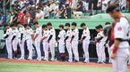 [OSEN=울산, 곽영래 기자] 6일 오후 울산 문수야구장에서 '2019 신한은행 마이카 KBO리그' 롯데 자이언츠와 한화 이글스의 경기가 열렸다.경기에 앞서 롯데 선수들이 현중일을 맞아 묵념하고 있다. /youngrae@osen.co.kr