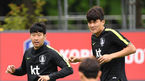 [OSEN=파주, 최규한 기자] 오는 11일 이란과의 평가전을 앞둔 대한민국 남자축구 국가대표팀이 10일 오전 파주 NFC에서 공식 훈련을 진행했다.손흥민과 김민재가 몸을 풀고 있다. /dreamer@osen.co.kr