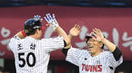 [OSEN=잠실, 곽영래 기자] 13일 오후 서울 잠실야구장에서 '2019 신한은행 마이카 KBO리그' LG 트윈스와 롯데 자이언츠의 경기가 열렸다.4회말 2사 1루 LG 조셉이 역전 투런홈런을 때린 뒤 김현수와 기뻐하고 있다. /youngrae@osen.co.kr