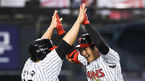 [OSEN=잠실, 박준형 기자] 21일 오후 서울 잠실구장에서 '2019 신한은행 MY CAR KBO리그' LG 트윈스와 KIA 타이거즈의 경기가 진행됐다.5회말 1사 1,2루 LG 오지환이 역전 3점 홈런을 날린뒤 김현수의 축하를 받고 있다/ soul1014@osen.co.kr