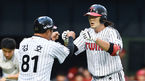 [OSEN=잠실, 박준형 기자] 21일 오후 서울 잠실구장에서 '2019 신한은행 MY CAR KBO리그' LG 트윈스와 KIA 타이거즈의 경기가 진행됐다.1회말 LG 이형종이 솔로홈런을 날린뒤 류중일의 감독의 축하를 받고 있다. / soul1014@osen.co.kr