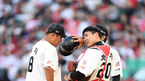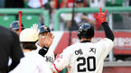 [OSEN=인천, 이대선 기자] 23일 오후 인천 SK행복드림구장에서 ‘2019년 신한은행 마이카 KBO리그’ SK 와이번스와 두산 베어스의 경기가 열렸다.4회말 1사 1루에서 SK 염경엽 감독이 홈런을 기록한 이재원을 축하하고 있다. / sun
