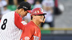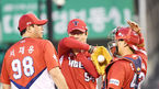 [OSEN=잠실, 민경훈 기자] 23일 오후 서울 잠실야구장에서 ‘2019년 신한은행 마이카 KBO리그’ LG 트윈스와 KIA 타이거즈 경기가 열렸다.7회말 1사 주자 1,2루 LG 전민수 타석에서 KIA 선발 양현종이 서재응 코치와 얘기를 나누고