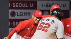 [OSEN=잠실, 최규한 기자] 26일 오후 서울 잠실야구장에서 ‘2019 신한은행 MY CAR KBO리그’ LG 트윈스와 SK 와이번스의 경기가 열렸다.5회초 무사 1, 2루 상황 SK 로맥의 역전 1타점 적시타 때 홈 세이프 된 한동민을 향해 염경엽