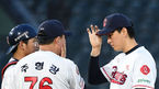 [OSEN=부산, 민경훈 기자] 27일 오후 부산 사직야구장에서 ‘2019 신한은행 MY CAR KBO리그’ 롯데 자이언츠와 kt 위즈의 경기가 열렸다.3회초 1사 주자 1,3루 kt 유한준 타석에서 롯데 주형광 코치가 마운드에 올라 선발 김원중과