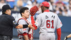 [OSEN=잠실, 박준형 기자] 27일 오후 서울 잠실야구장에서 ‘2019 신한은행 MY CAR KBO리그’ LG 트윈스와 SK 와이번스의 경기가 열렸다.2회말 1사 1,2루 LG 정주현의 1타점 적시타 이후 SK 선발투수 소사가 허도환 포수와 이야기를