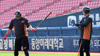 [OSEN=잠실, 지형준 기자] 2일 오후 서울 잠실야구장에서 ’2019 신한은행 MY CAR KBO 리그’ LG 트윈스와 한화 이글스의 경기가 열린다.경기에 앞서 한화 김태균, 송광민이 훈련을 하고 있다. /jpnews@osen.co.kr