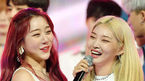 [OSEN=고양, 민경훈 기자] 3일 오후 경기도 고양시 일산동구 MBC드림센터에서 MBC 뮤직 '쇼 챔피언(Show Champion)' 생방송이 진행됐다. 이 날 쇼 챔피언 1위를 한 청하가 같은 아이오아이 멤버였던 우주소녀 연정과 기쁨을 나누고 있다./