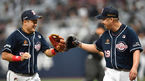 [OSEN=고척, 곽영래 기자] 4일 오후 서울 고척 스카이돔에서 '2019 신한은행 MY CAR KBO리그’ 키움 히어로즈와 두산 베어스의 경기가 열렸다.4회말 이닝을 마친 두산 유희관이 최주환과 글러브 터치를 하고 있다. / youngrae@osen.co.kr