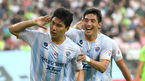 [OSEN=전주, 최규한 기자] 14일 오후 전주월드컵경기장에서 ’하나원큐 K리그1 2019’ 전북 현대와 울산 현대의 경기가 열렸다.전반 울산 주민규가 동점골을 작렬시킨 뒤 동료들과 인사를 나누고 있다. /dreamer@osen.co.kr