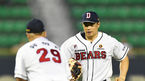 [OSEN=잠실, 박재만 기자] ‘2019 신한은행 MY CAR KBO리그’ 두산 베어스와 kt 위즈의 경기가 17일 오후 서울 잠실야구장에서 열렸다.4회초 두산 선발투수 유희관이 호수비로 자신을 도운 김재환을 맞이하고 있다. /pjmpp@osen.co.kr