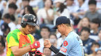[OSEN=창원, 이대선 기자] 21일 오후 경남 창원NC파크에서 ‘프로야구 2019 MY CAR KBO 올스타전’이 열렸다.2회초 무사에서 SK 김태훈이 로맥에게 거수경례를 하고 있다. /sunday@osen.co.kr