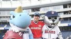 [OSEN=창원, 곽영래 기자] 21일 오후 경남 창원NC파크에서 ‘프로야구 2019 MY CAR KBO 올스타전’이 열렸다.NC 박민우가 마스코트들과 기념촬영을 하고 있다. /youngrae@osen.co.kr