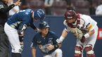 [OSEN=고척, 곽영래 기자] 27일 오후 서울 고척스카이돔에서 '2019 신한은행 MY CAR KBO리그' 키움 히어로즈와 NC 다이노스의 경기가 열렸다.3회초 2사 2루 NC 손시헌이 김태진의 안타때 홈을 쇄도하다 손 통증을 호소하고 있다. / youngrae@