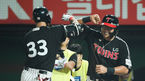 [OSEN=수원, 박준형 기자] 28일 오후 경기도 수원 KT위즈파크에서 ‘2019 신한은행 MY CAR KBO리그’ kt wiz와 LG 트윈스의 경기가 열렸다.6회초 무사 1루 LG 박용택이 2점 홈런을 날린뒤 1루 주자 채은성과 하이파이브를 하고있다. 박