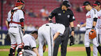 [OSEN=잠실, 박준형 기자] 31일 오후 서울 잠실야구장에서 '2019 신한은행 MY CAR KBO리그' LG 트윈스와 키움 히어로즈의 경기가 열렸다.7회초 LG 송은범이 키움 임병욱 타구 맞은뒤 고통스러워하고 있다 / soul1014@osen.co.kr