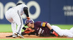 [OSEN=잠실, 박준형 기자] 1일 오후 서울 잠실야구장에서 '2019 신한은행 MY CAR KBO리그' LG 트윈스와 키움 히어로즈의 경기가 열렸다.3회초 무사 1루 키움 김혜성의 타석때 1루 주자 이지영이 LG 오지환 유격수에게 태그아웃되자 아쉬