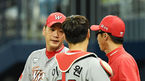 [OSEN=고척, 민경훈 기자] 8일 오후 서울 고척스카이돔에서 ‘2019 신한은행 MY CAR KBO리그' 키움 히어로즈와 SK 와이번스의 경기가 열렸다.8회말 2사 주자 1,2루 키움 샌즈 타석에서 SK 선발 김광현이 손혁 코치와 얘기를 나누고 있