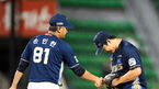 [OSEN=잠실, 지형준 기자] 11일 오후 서울 잠실야구장에서 ’2019 신한은행 MY CAR KBO 리그’ 두산 베어스와 NC 다이노스의 경기가 열렸다.8회말 무사에서 NC 최성영이 교체되며 손민한 코치와 악수를 하고 있다. /jpnews@osen.co.kr