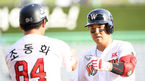 [OSEN=인천, 곽영래 기자] 19일 오후 인천 SK 행복드림구장에서 '2019 신한은행 마이카 KBO리그' SK 와이번스와 두산 베어스의 더블헤더 1차전이 열렸다.4회말 2사 1,3루 SK 나주환이 적시타를 때려낸 쥐 조동화 코치와 주먹을 맞대고 있