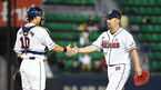 [OSEN=잠실, 곽영래 기자] 20일 오후 서울 잠실 야구장에서 '2019 신한은행 MY CAR KBO리그' 두산 베어스와 KIA 타이거즈의 경기가 열렸다.8회초 2사 두산 유희관이 마운드를 내려오기 전 박세혁과 악수를 나누고 있다. / youngrae@osen.co.kr