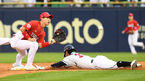 [OSEN=잠실, 곽영래 기자] 21일 오후 서울 잠실 야구장에서 '2019 신한은행 MY CAR KBO리그' 두산 베어스와 KIA 타이거즈의 경기가 열렸다.1회말 무사 1루 두산 정수빈이 2루 도루를 성공하고 있다. / youngrae@osen.co.kr