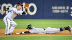 [OSEN=잠실, 지형준 기자] 23일 오후 서울 잠실야구장에서 '2019신한은행 MYCAR KBO리그' 한화 이글스와 LG 트윈스의 경기가 열렸다.5회초 1사에서 한화 송광민이 LG 정주현의 태그에 앞서 2루 도루에 성공하고 있다./jpnews@osen.co.kr