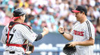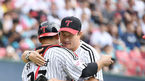 [OSEN=잠실, 곽영래 기자] 3일 오후 서울 잠실야구장에서 '2019 신한은행 MY CAR KBO 포스트시즌' LG 트윈스와 NC 다이노스의 와일드카드 결정전 1차전이 열렸다.봉중근 해설위원이 시구를 마친 뒤 유강남과 포옹을 하고 있다. /youngrae@ose