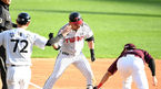 ㅍOSEN=잠실, 곽영래 기자] 9일 오후 서울 잠실야구장에서 '2019 신한은행 MY CAR KBO 포스트시즌' 준플레이오프 3차전 LG 트윈스와 키움 히어로즈의 경기가 열렸다.7회말 무사 LG 정주현이 안타를 때린 뒤 3루까지 진루하고 있다. /youngr